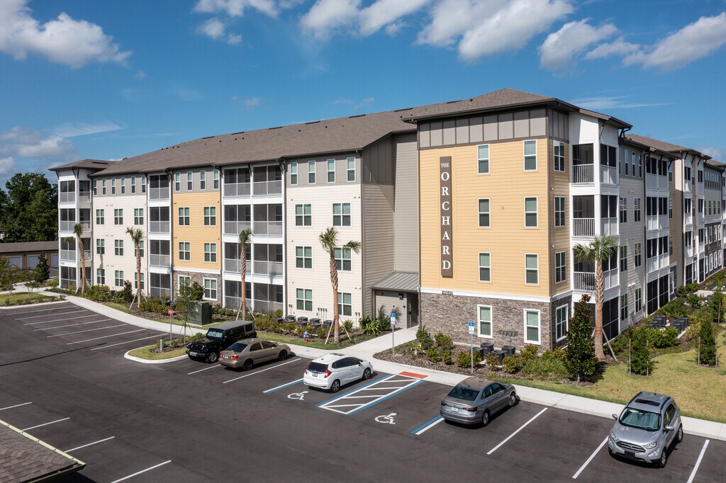 55+ SMOKE FREE, four-story upscale building complete with elevators and eight unique one and two-bedroom floorplans. Amazing community features and amenities including a resort-style pool with sandy beach relaxation area, state-of-the-art Fitness Center, Pickleball Court, a private Bark Park for our furry residents, and a resident lounge. The Orchard offers convenient access with walking paths for exploring the Town Center, our weekly Farmer's Market, and public library. Interior highlights include granite countertops throughout, custom cabinets and lighting, and private screened-in patios or balconies. Enjoy premium amenities like wood-inspired flooring, spacious walk-in closets, subway tile backsplash in the kitchen, carpeted bedrooms and designer finishes throughout. Each home comes with a Full-Size Energy STAR Whirlpool Washer and Dryer and stainless-steel appliances. The Orchard is conveniently located to major highways, nearby hospital and medical services, theme parks, and an abundance of shopping, dining and entertainment options in the area. Stop by for a tour of our community today!