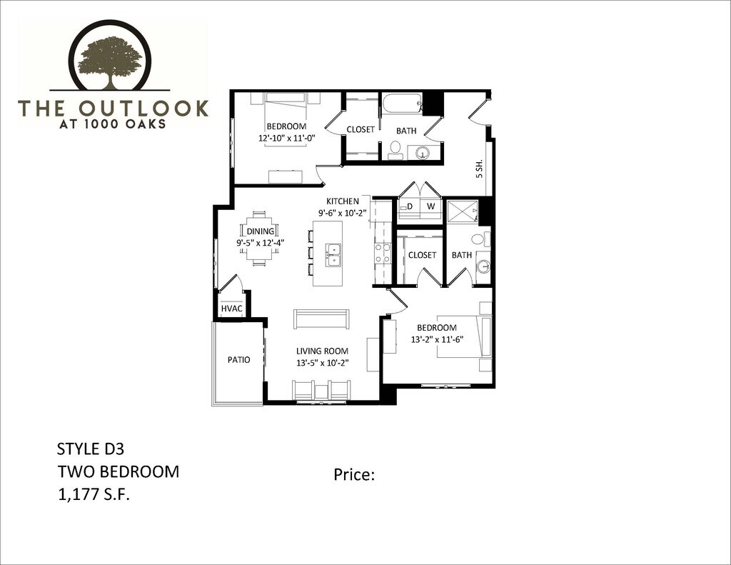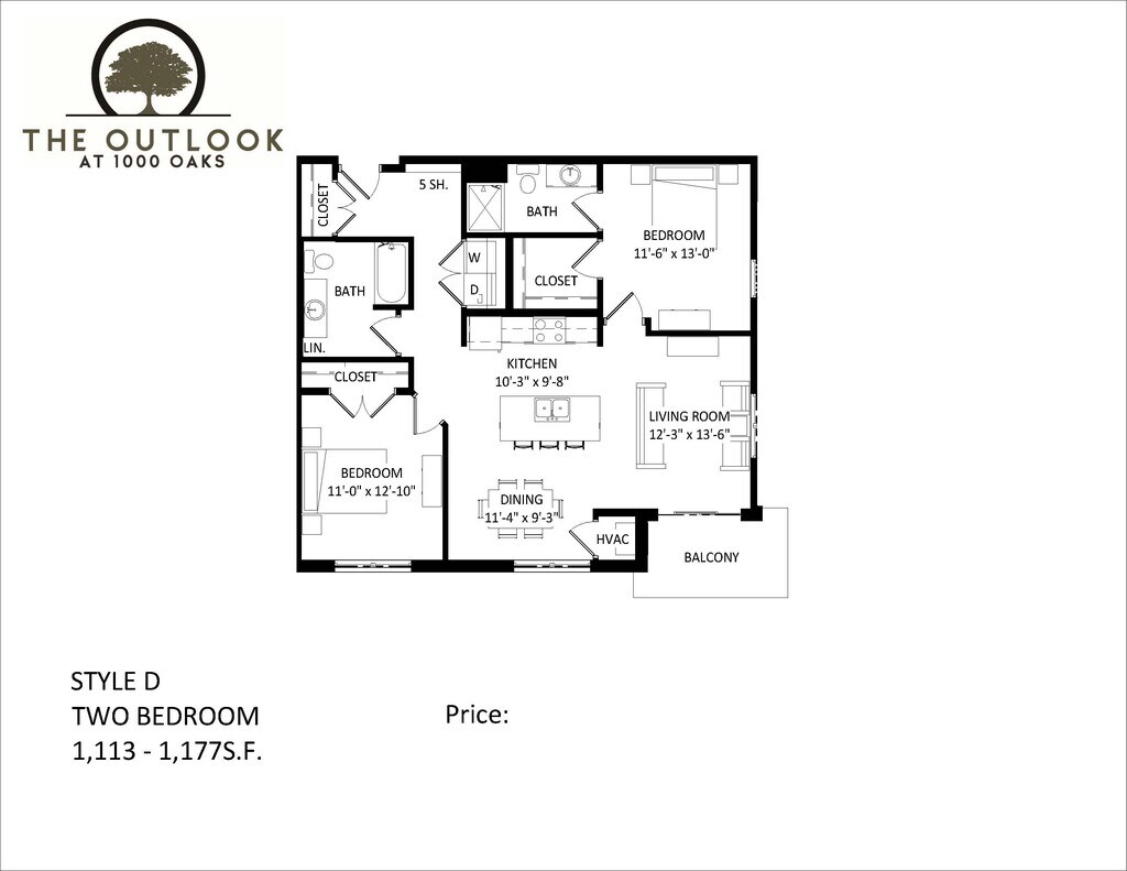 Apartment Model: Style DFrom $2,1002 Bedroom, 2 Bath, 1113-1149 sq ftUnavailable![]() - Style D - Floorplan 1 - Style D12 Beds, 2 Baths, 1117-1177 sq ft- Model Gallery- Floorplans- Availability Details- Price - Availability Date - Unit - Sq Ft - From $2,100 - Call for Availability - Style D1 - 1117-1177 sq ft - Model Amenities and Features- Features- Air Conditioning