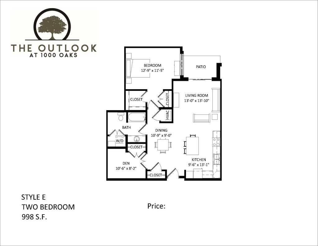 - Style E (1+Den)1 Bed, 1 Bath, 998 sq ft- Model Gallery- Floorplans- Availability Details- Price - Availability Date - Unit - Sq Ft - $1,925 - Call for Availability - Style E (1+Den) - 998 sq ft - Model Amenities and Features- Features- Air Conditioning