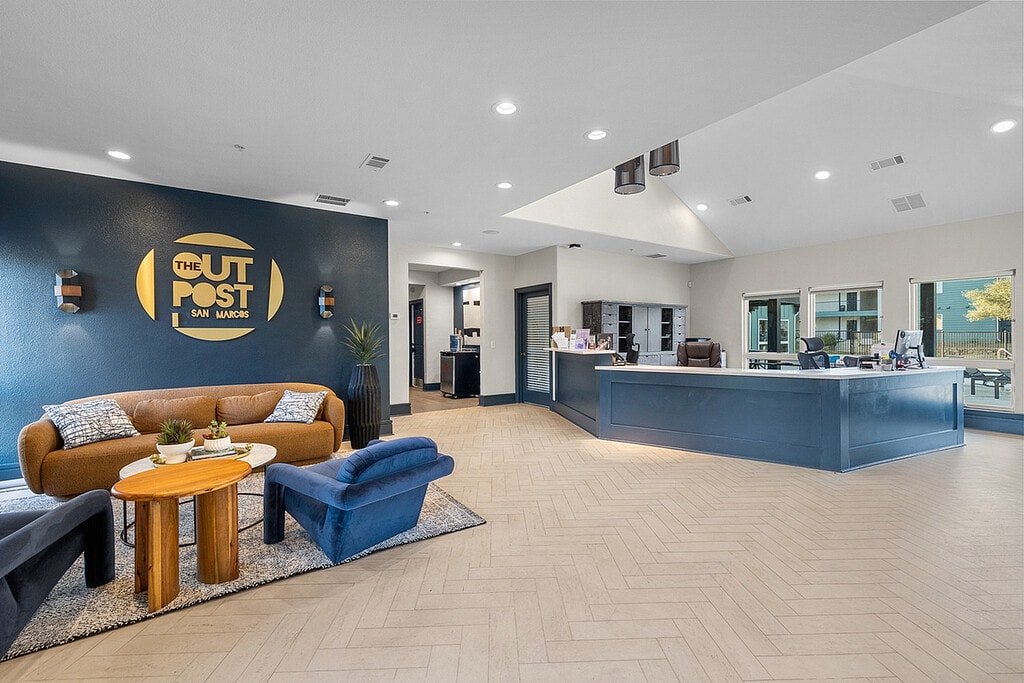 Welcome to The Outpost San Marcos - premier off-campus apartments in San Marcos, TX; located on Post Road near Texas State University's Bobcat Stadium. We offer 2, 3 and 4 bedroom pet friendly apartments, all with private furnished bedrooms and private bathrooms. Each of our apartments feature faux wood flooring, leather style living room furniture, high speed internet and cable, a full-size washer and dryer, and private balconies, and keyless entry with app-based access - no key, no hassle! Choose from our premium floor plans to upgrade your apartment with new stainless steel appliances and a 55" Smart TV included in your living room furniture package! The Outpost is the first stop on the Texas State University shuttle service's Post Road route, making your commute to class easy. When you're not in class, you'll enjoy our community amenities such as our resort style pool with a sun deck and hot tub, grilling stations, sand volleyball court, pickleball court, 24-hour fitness center, and 24-hour business center.