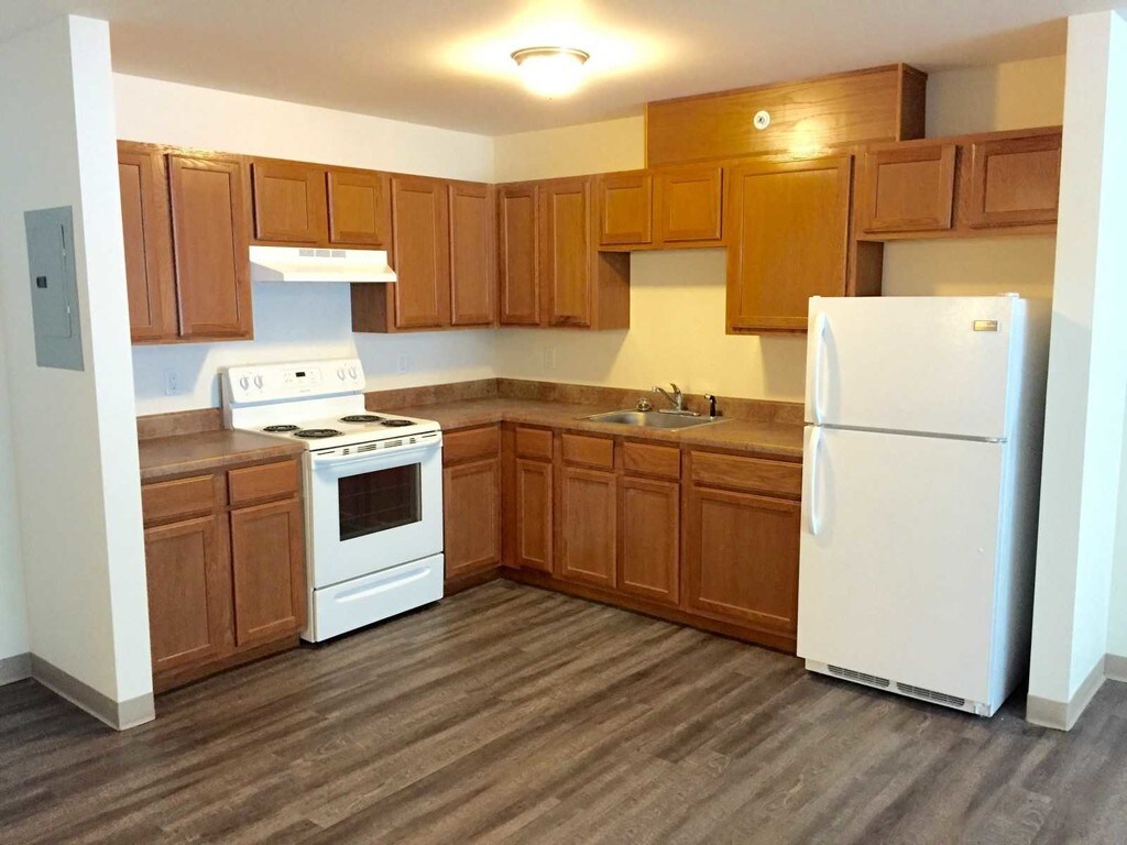 Our renovated 1-bedroom apartments offer a full kitchen with wood-style flooring, an in-unit washer and dryer, a welcoming living area, a bedroom with a generous closet, and a bathroom with a shower/tub combination.