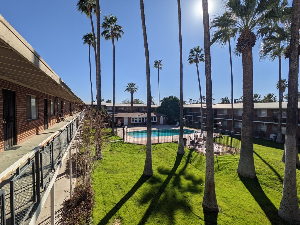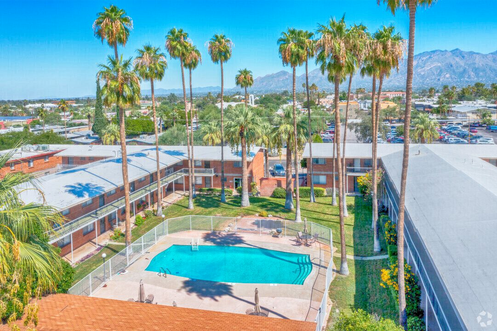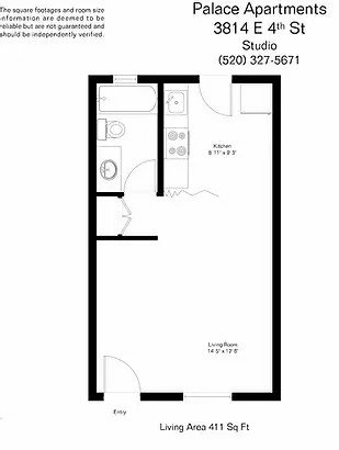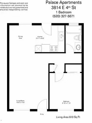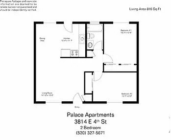 The Palace is 2 miles east of the University of Arizona and near many other desirable landmarks. Our community is on a quiet street near medical labs and offices, two small parks, and several commercial districts. A CVS drugstore is around the corner. El Con Mall, Charter schools, the Desert Springs Academy and the top-ranked Basis elementary school are a 10-minute walk away. Loft Theater, Whole Foods Grocery, public tennis courts/golf courses, and many restaurants are all less than a mile away. The Palace is a 3-minute walk from a stop on the #3 bus line, which runs straight to the UA. All units are recently upgraded and many have tile floors. Each unit has front and rear (parking lot) entrances. One and two bedroom apartment homes have assigned covered parking inlcuded. All utilities are paid by the complex and billed in a monthly RUBS flat rate. Only internet and cable need to be setup with the company of your choice.