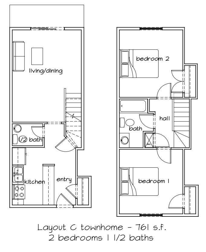 Apartment Model: C 2 Bedroom, 1.5 bathroomTownhome2 Bedroom, 1.5 Bath, 761 sq ftUnavailableFloorplansPhotos![]()