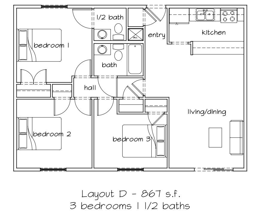 Apartment Model: D 3 Bedroom, 1.5 Bathroom3 Bedroom, 1.5 Bath, 867 sq ftUnavailableFloorplansPhotos![]()
