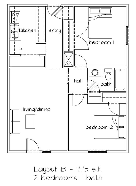 Apartment Model: B 2 Bedroom, 1 Bathroom2 Bedroom, 1 Bath, 775 sq ftUnavailableFloorplansPhotos![]()