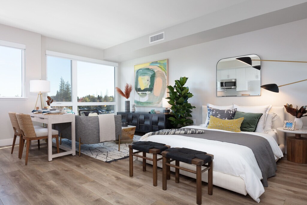 The Palomino is a boutique community of thoughtfully designed one-bedroom homes that epitomize refined living. Our open-concept floorplans offer both style and convenience, featuring large windows, quartz countertops, wood-style flooring, stainless steel appliance, in-home washers and dryers, ample closet space and private patios and balconies in many residences. We are a pet-friendly community with services and amenities to help make every day convenient and relaxing with underground parking, bike storage and repair as well as Amazon package lockers. You’ll love having exclusive access to our rooftop lounge where you can relax by the fireplace or entertain friends at the outdoor dining area and grill.
