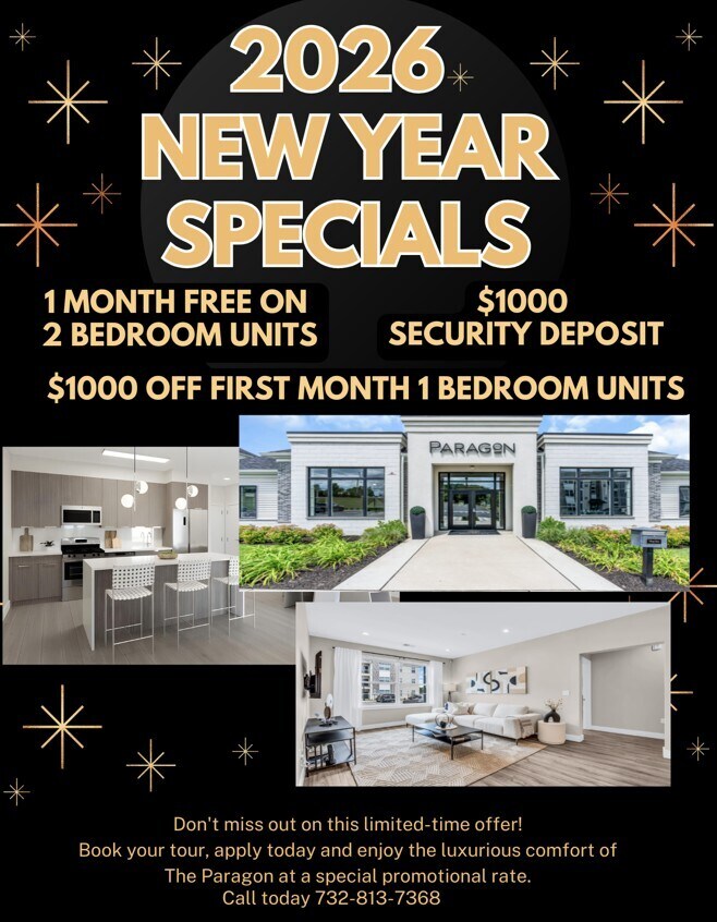 The current rent special at The Paragon is: New Year Special!~~1 Month Free on select 2 Bedroom Units! $1000 off first month rent - 1 Bedroom Units! $1000 Security Deposit! Don't miss out on this limited time offer! Book your tour, apply today and enjoy the luxurious comfort of The Paragon at a special promotional rate! Call the leasing office for details!.