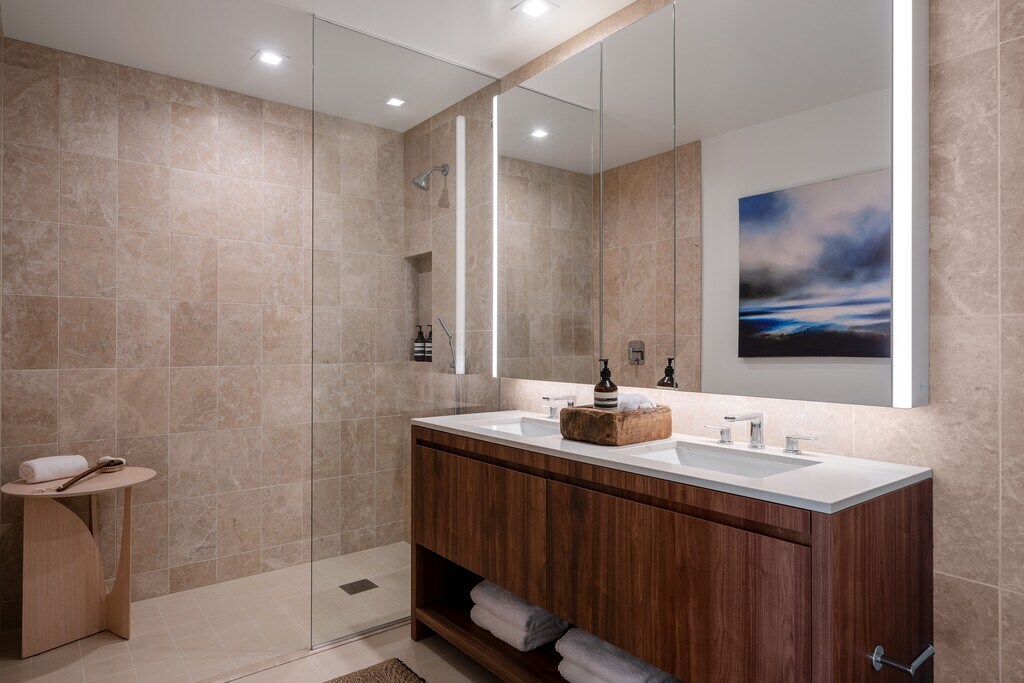 - Light and dark-colored walnut vanities