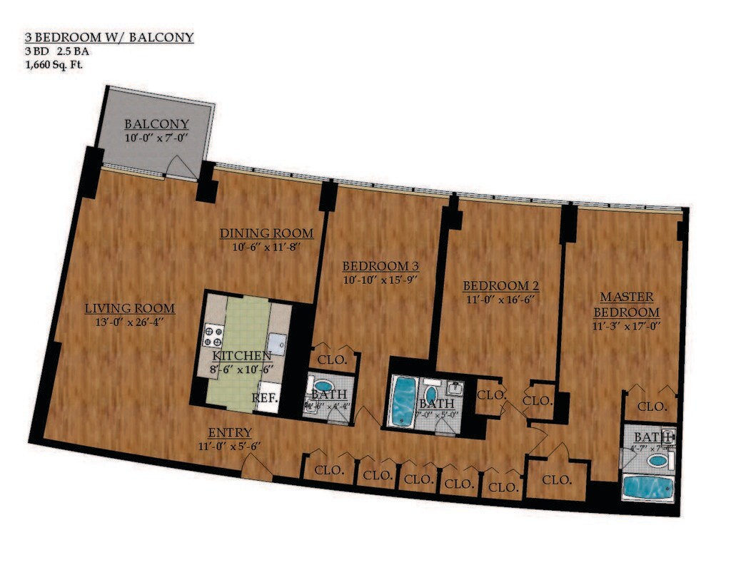 Two Bedroom Two Bath Balcony - Floorplan 1 3 Bedrooms