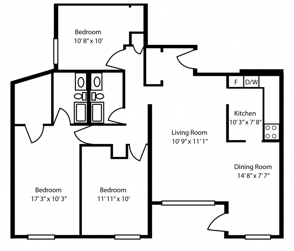 2 Bed 1 Bath B - Floorplan 1 3 Bedrooms