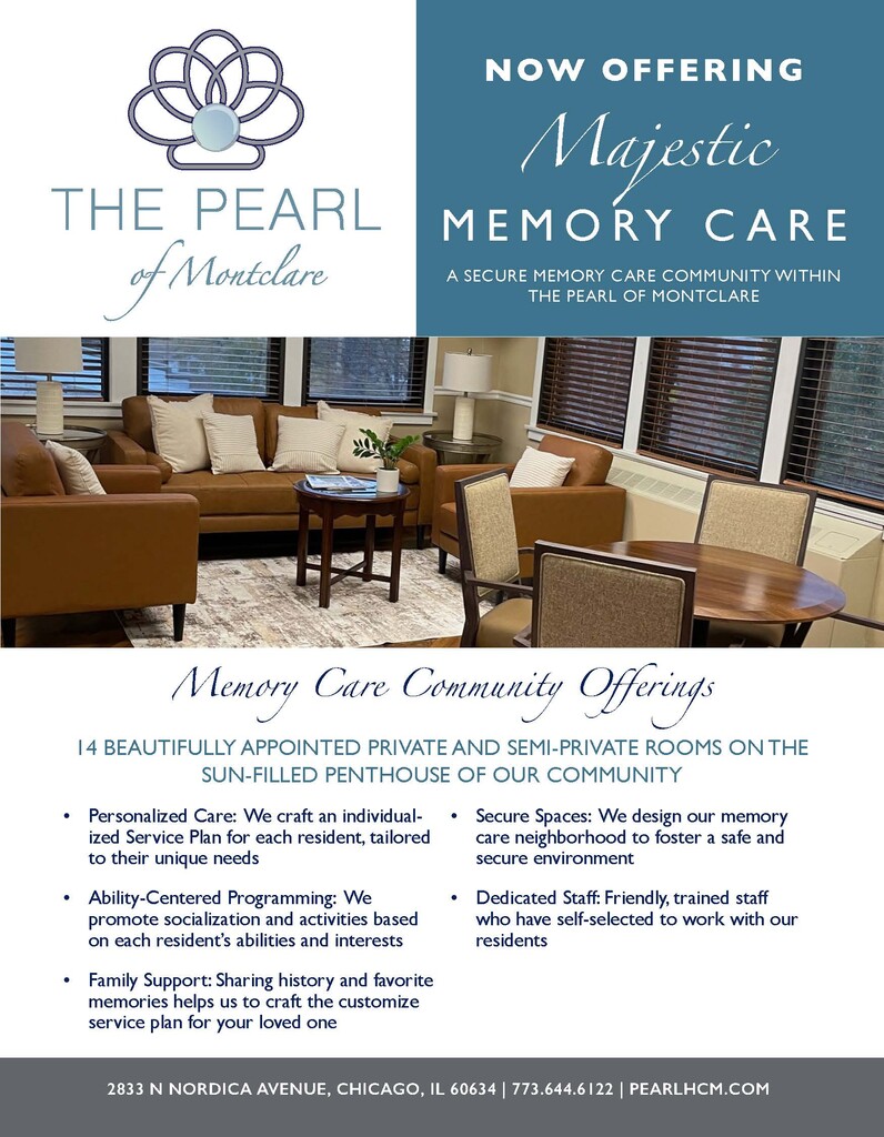 For over 100 years, The Pearl of Montclare has had a presence in the community that has empowered residents to live independent and full lives. In addition to providing skilled nursing and long-term care, the Pearl of Montclare proudly serves individuals needing Memory Care in a secured, top floor of our community. We offer our memory support solutions for seniors with early to mid-stage dementia. Located in our sun-filled penthouse, our memory care program is exceptionally person-centric, friendly and secure. We don't fear the aging process-we embrace it as part of life. Transitioning to a nursing home can be emotionally challenging process. The Pearl of Montclare's team of experienced, compassionate professionals can help you and your love ones feel comfortable that you made the right choice.