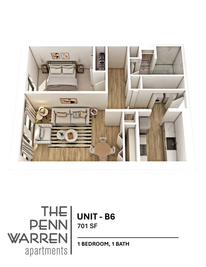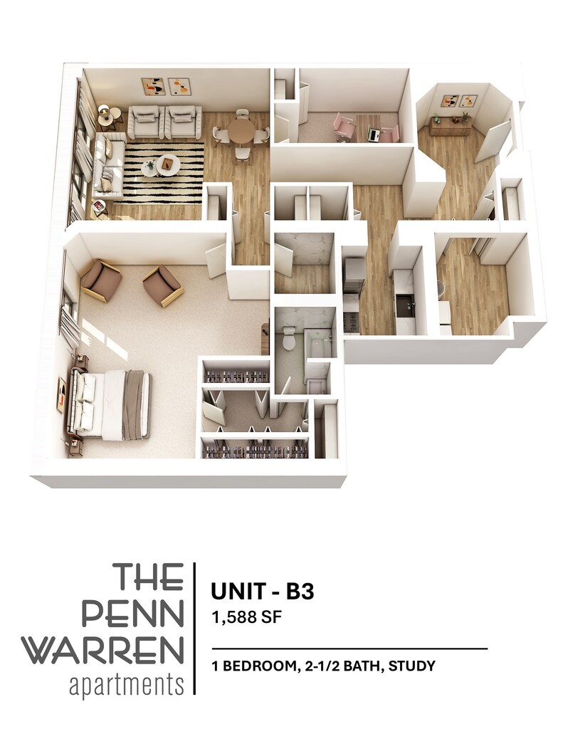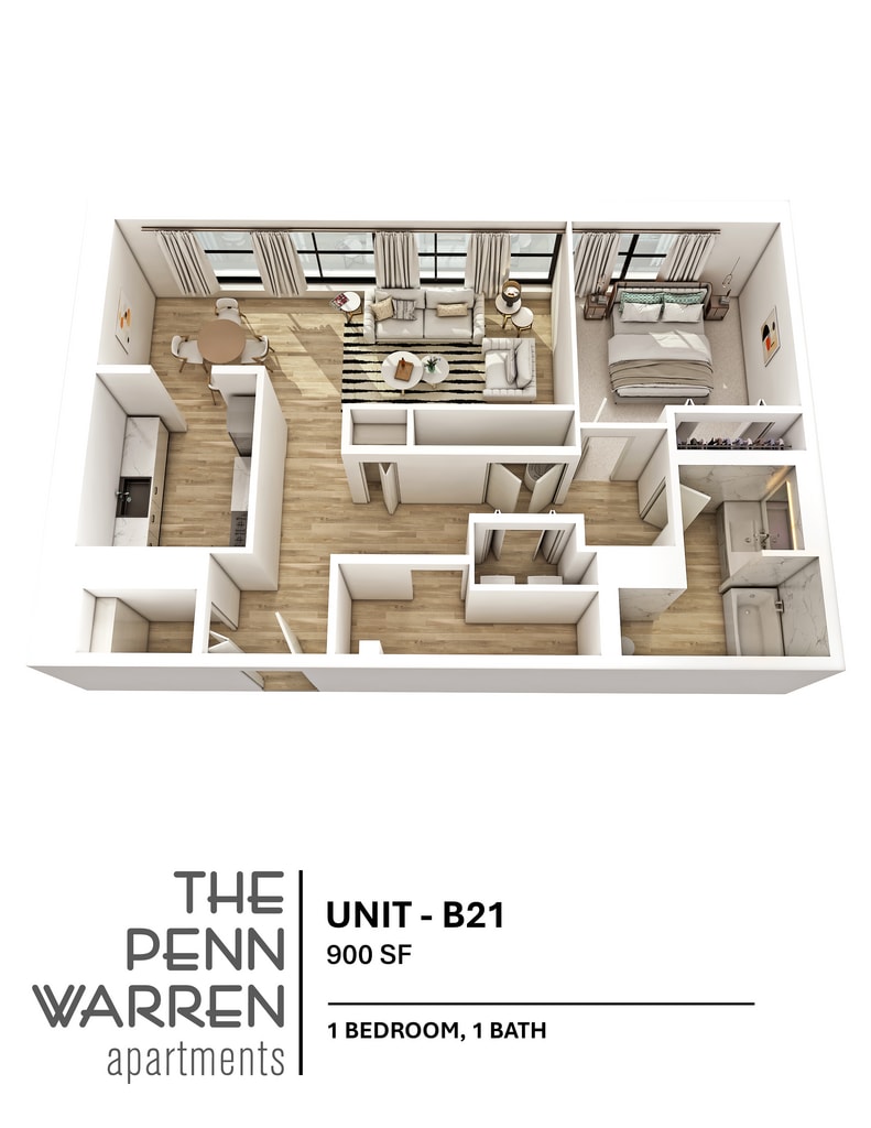 The Penn Warren offers 1 to 3 Bedroom apartments starting from $995 and having 680–1,588 sq ft. Here is the current pricing and availability: