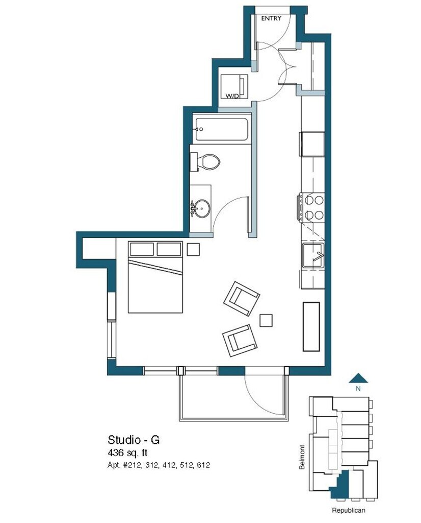 Studio (MFTE) - Floorplan 10 Apartment Unit: 309Apartment Model: Studio (MFTE)$1,550Studio, 1 Bath, 442 sq ftAvailable NowStudio