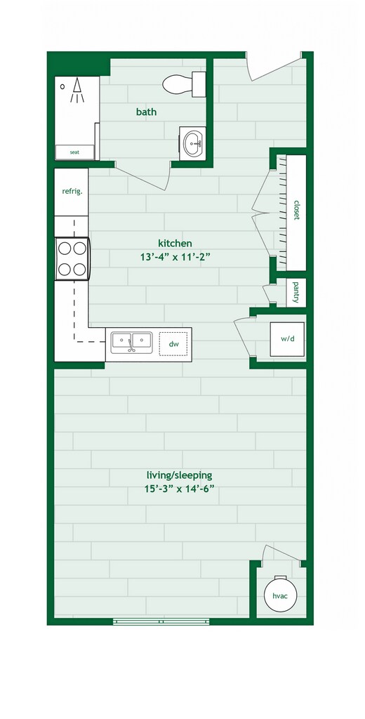 Apartment Model: 0 Bed 1 Bath - 496 Sq. Ft.Studio, 1 Bath, 496 sq ftAvailable Now![]()