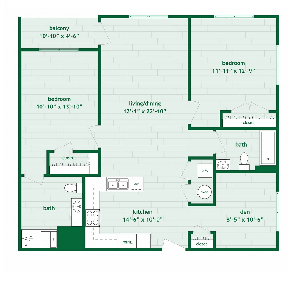 Apartment Model: 2 Bed 2 Bath with Den - 1,134 Sq. Ft.2 Bedroom, 2 Bath, 1134-1143 sq ftAvailable Now![]()