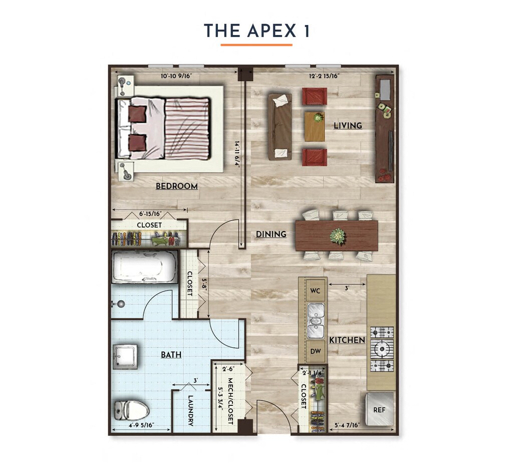 The Apex 1 - Floorplan Apartment Unit: 506EEApartment Model: The Apex 11 Bedroom, 1 Bath, 713 sq ftAvailable June 5, 2026![]()