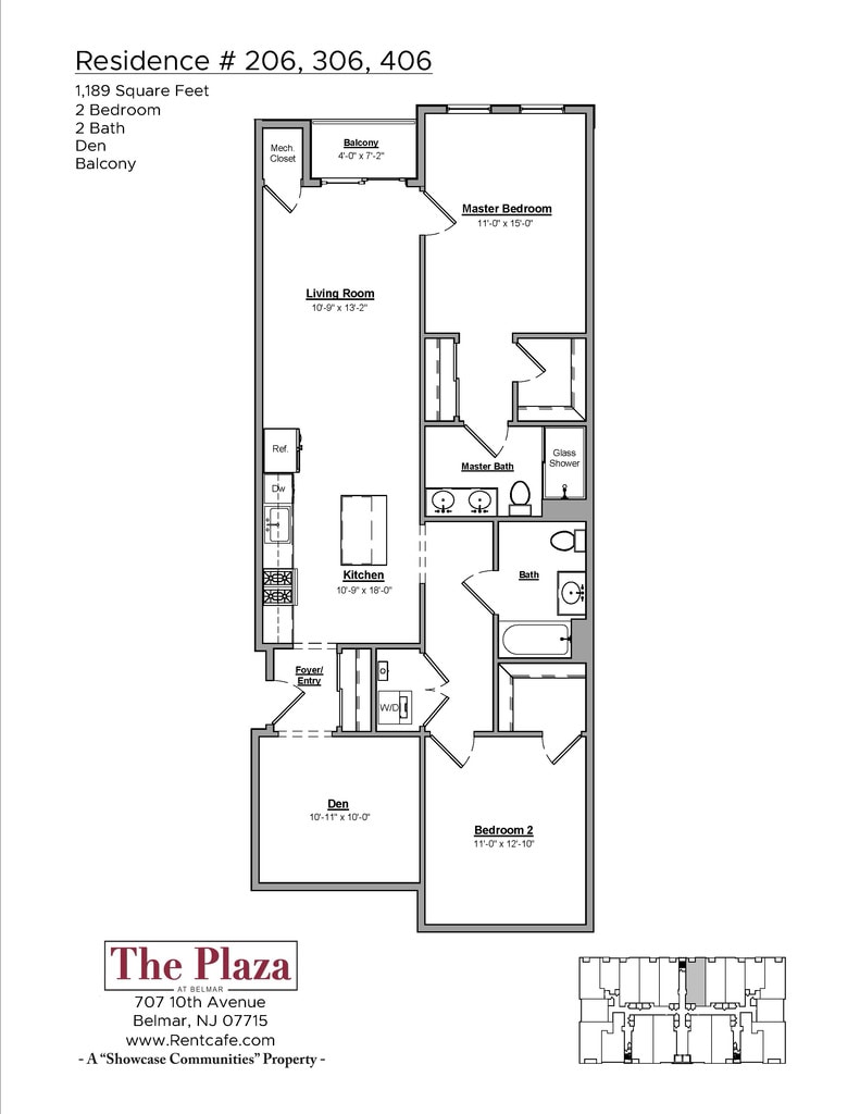 2 BD / 2 BA + DEN - Floorplan 4 Apartment Unit: 206Apartment Model: 2 BD / 2 BA + DEN$3,4002 Bedroom, 2 Bath, 1189 sq ftAvailable April 1, 2026
