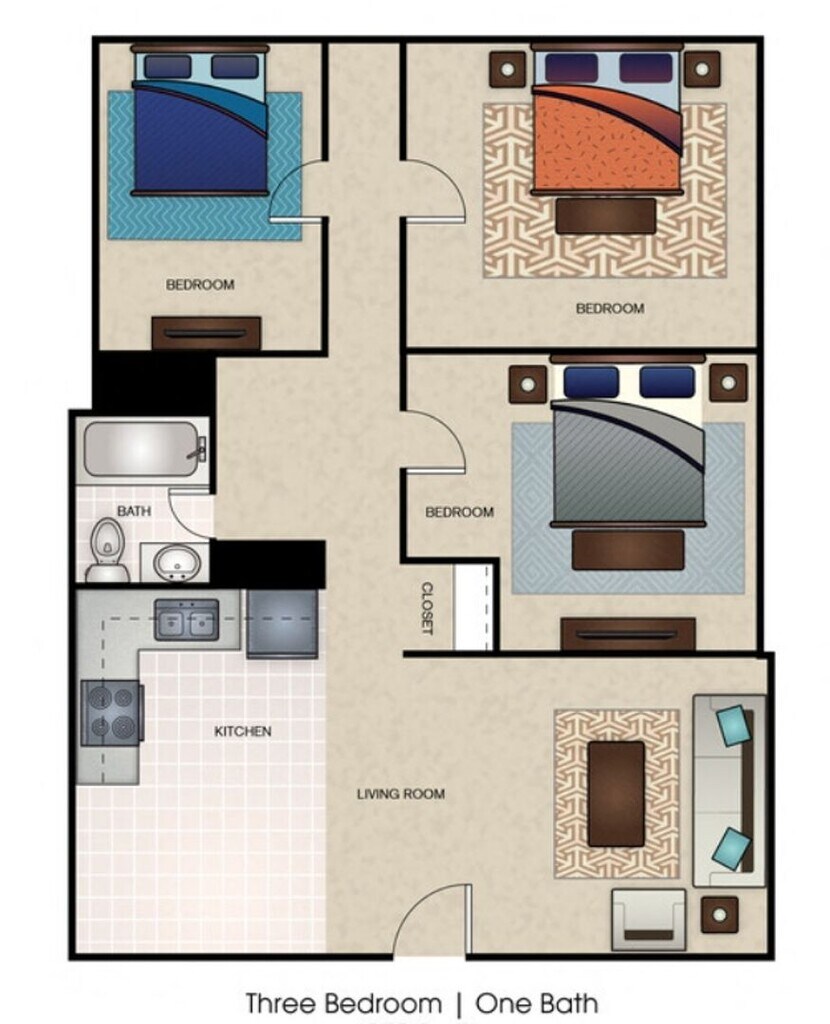Apartment Model: 3 Bed/1 Bath$1,2993 Bedroom, 1 Bath, 1100 sq ftAvailable Now![]()