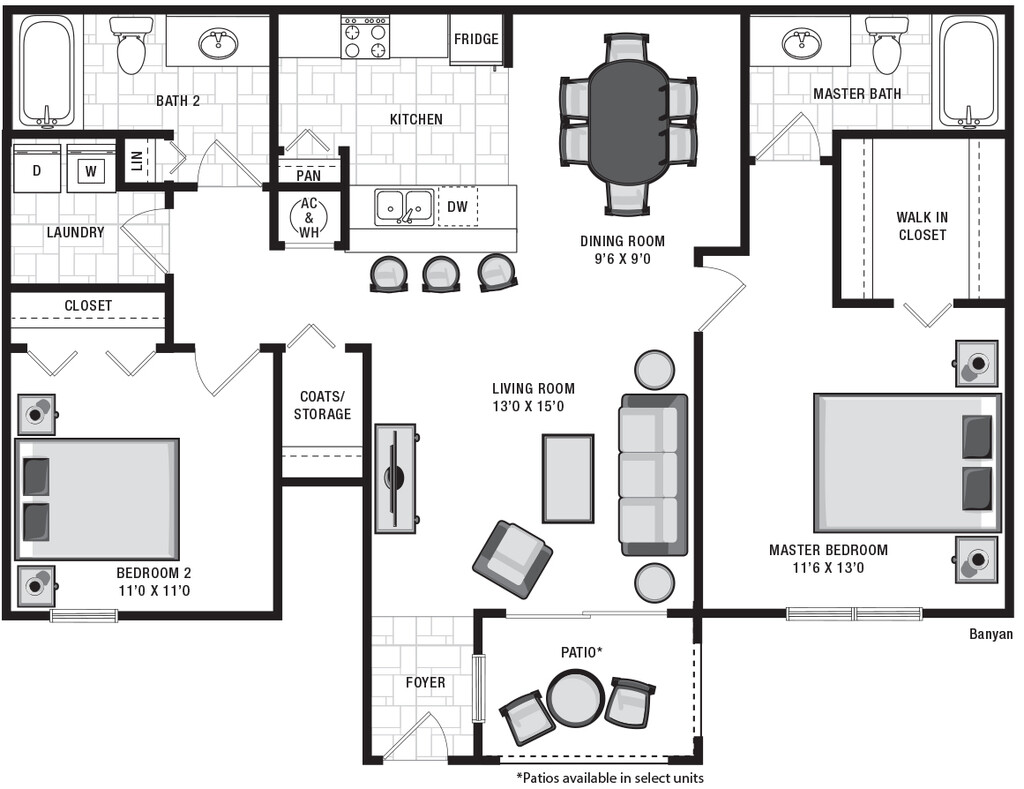 Apartment Model: BanyanFrom $1,5522 Bedroom, 2 Bath, 1040 sq ftAvailable Now![]()