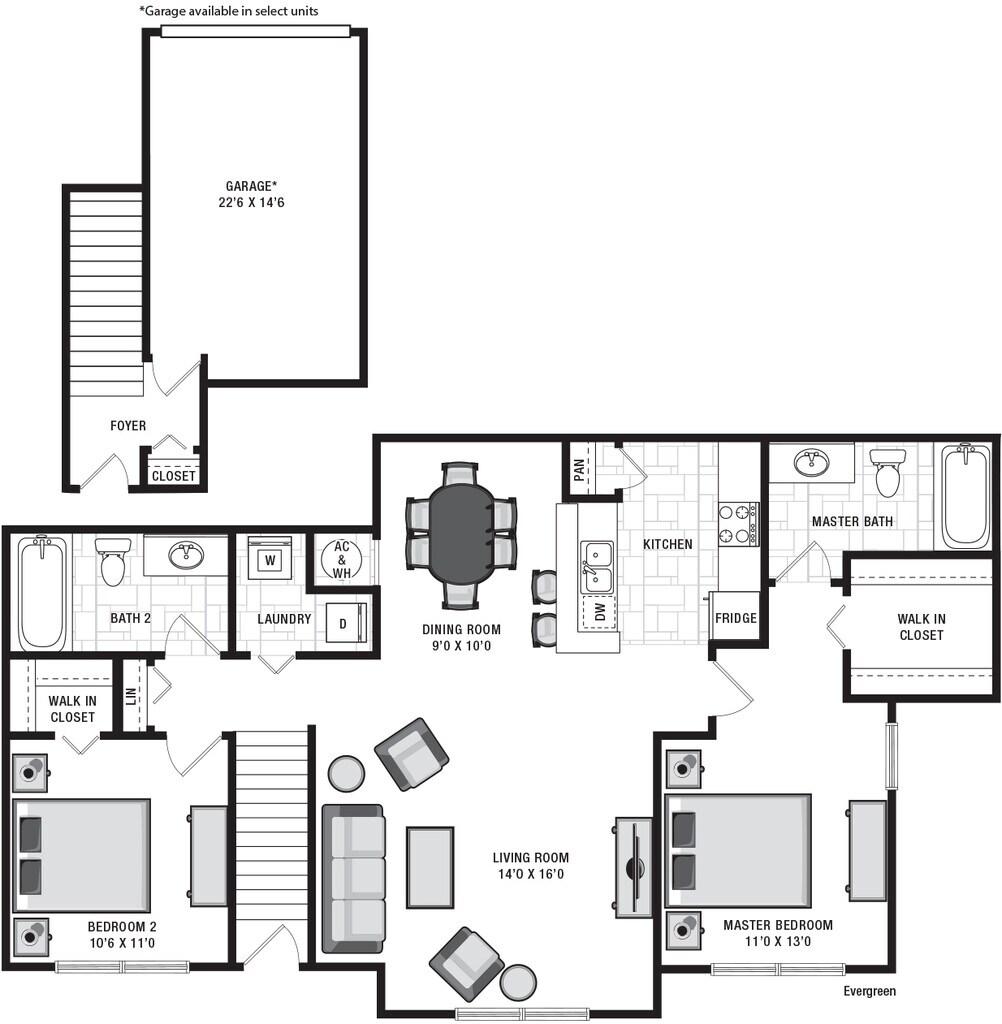 Apartment Model: EvergreenCall For Rates2 Bedroom, 2 Bath, 1077 sq ftUnavailable![]()