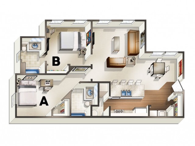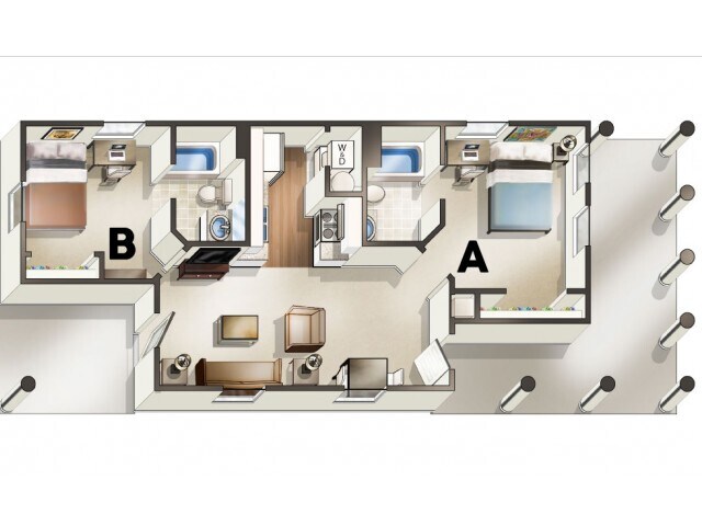 Apartment Model: B2 Floor Plan (Burgundy)From $7372 Bedroom, 2 Bath, 956 sq ftAvailable Now![]()