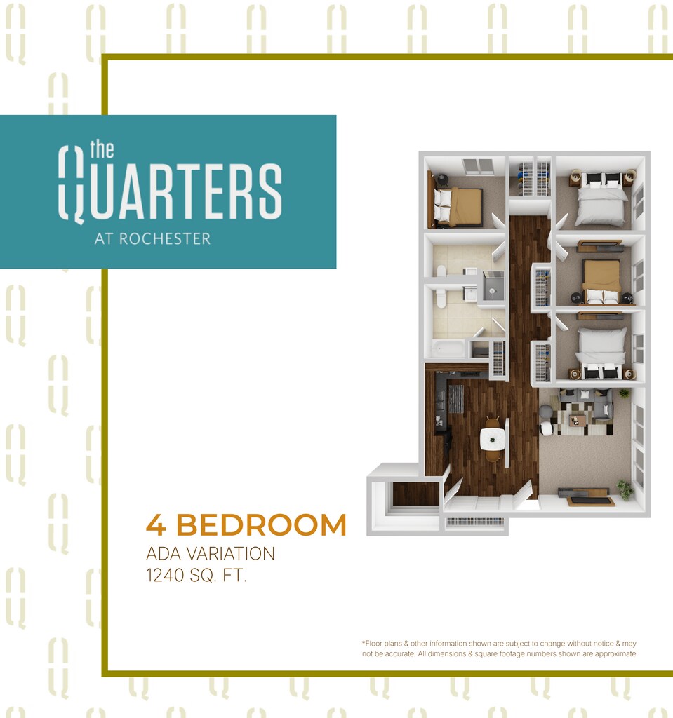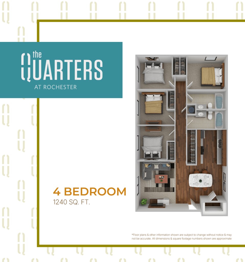 The Quarters at Rochester offers comfortable apartment living designed for connection, convenience, and everyday balance. Located just steps from Rochester Community and Technical College (RCTC), our community blends value-driven living with the flexibility todays residents are looking for. Choose from spacious 2- and 4-bedroom apartment homes ideal for roommates, students, or anyone looking for a well-designed place to call home. Whether youre here for school, work, or your next chapter, The Quarters provides a welcoming setting that fits your lifestyle.
