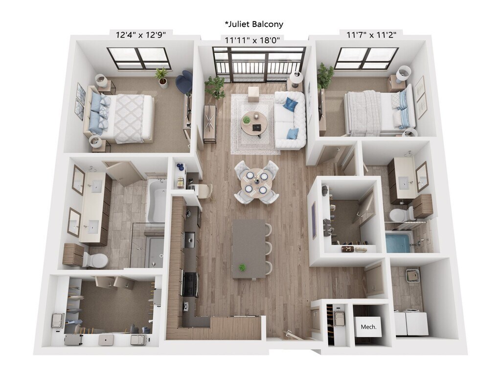 - Walk-in showers and dual sinks *