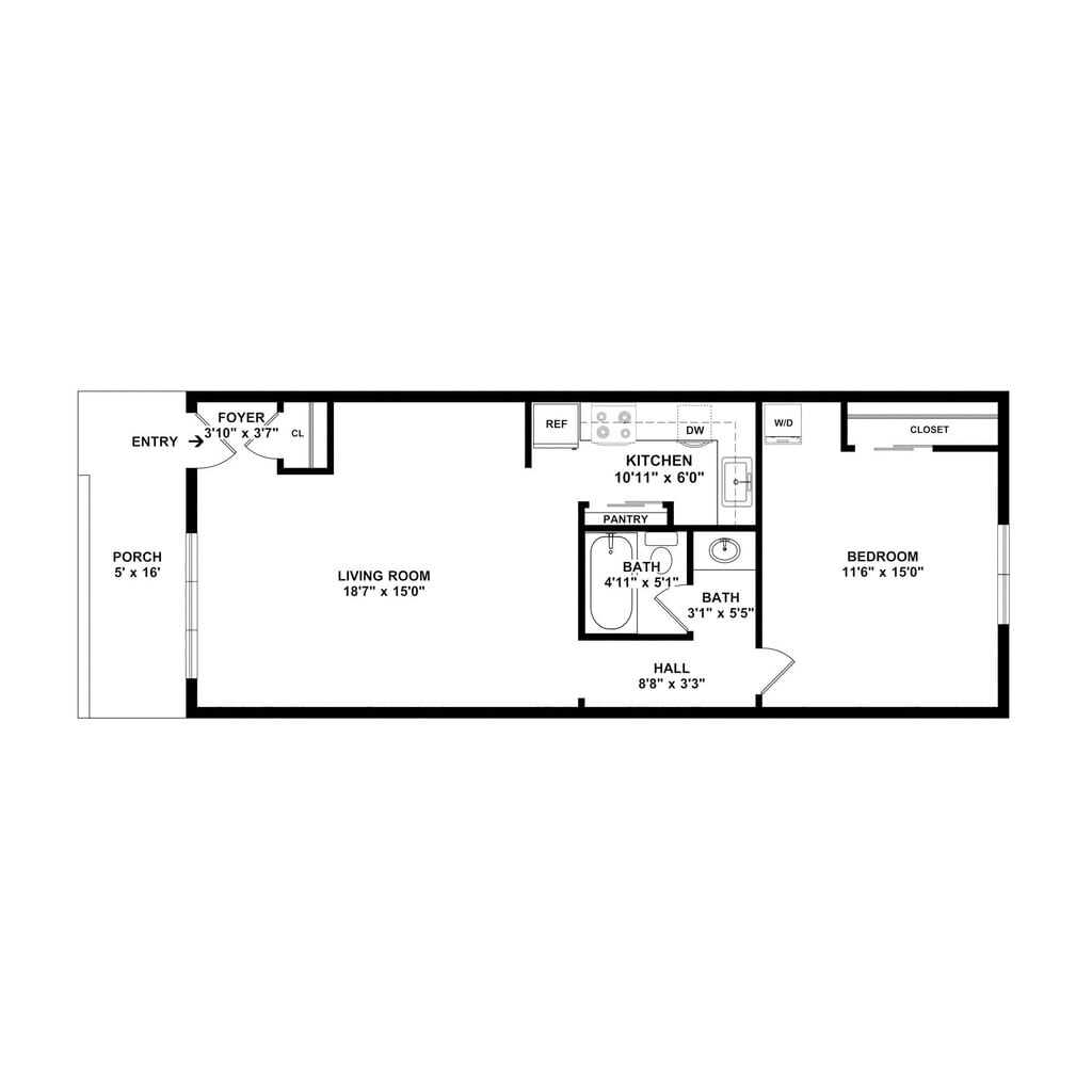 Apartment Model: A1-G$1,1501 Bedroom, 1 Bath, 625 sq ftAvailable NowFloorplansPhotos![]()