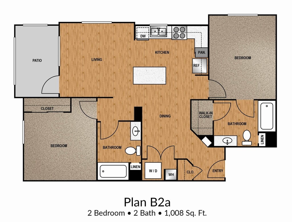 Apartment Model: B2a Downstairs$1,9852 Bedroom, 2 Bath, 1008 sq ftAvailable Now![]()