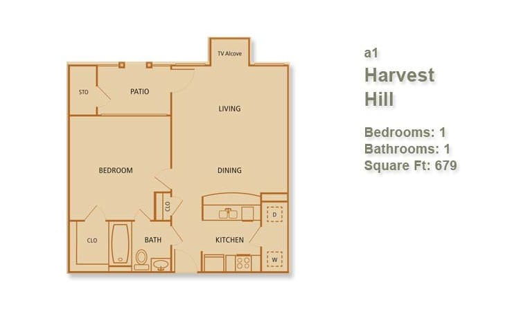 Apartment Model: Harvest Hill DownFrom $1,5401 Bedroom, 1 Bath, 679 sq ftAvailable Now![]()