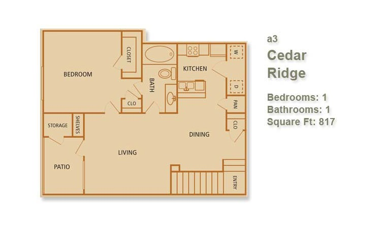 Apartment Model: Cedar Ridge 1 carFrom $1,4351 Bedroom, 1 Bath, 817 sq ftAvailable Now![]()