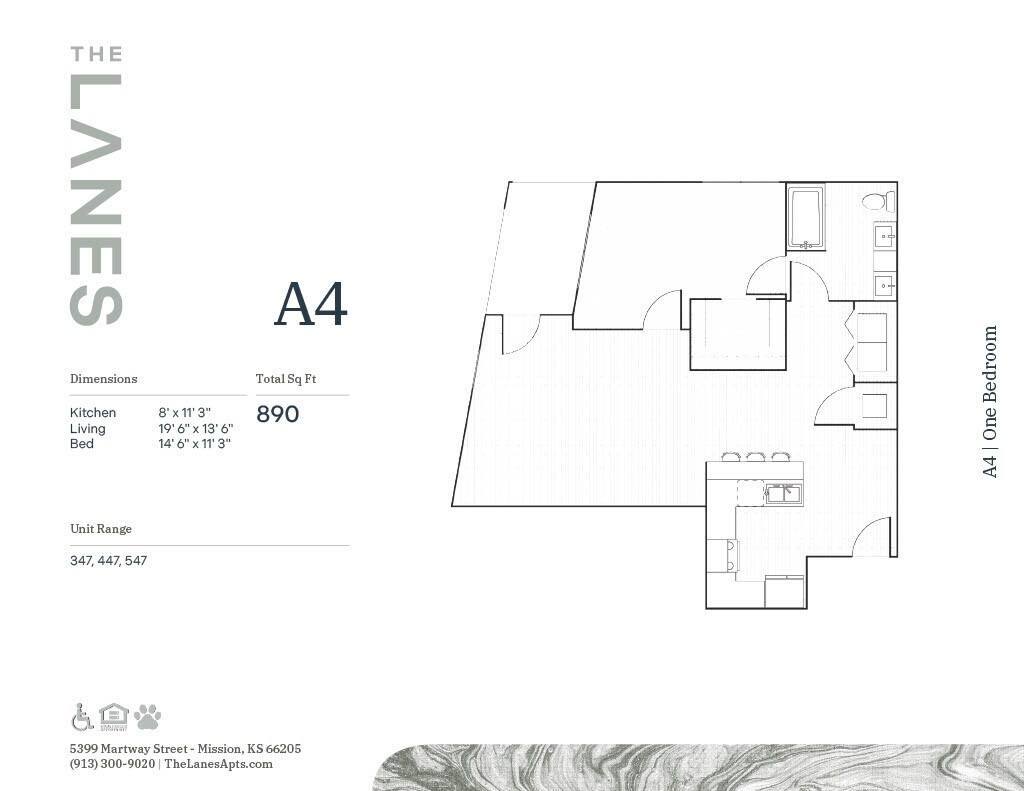A4 - Floorplan 1 Apartment Unit: 347Apartment Model: A41 Bedroom, 1 Bath, 890 sq ftAvailable December 23, 2025Floorplan A3