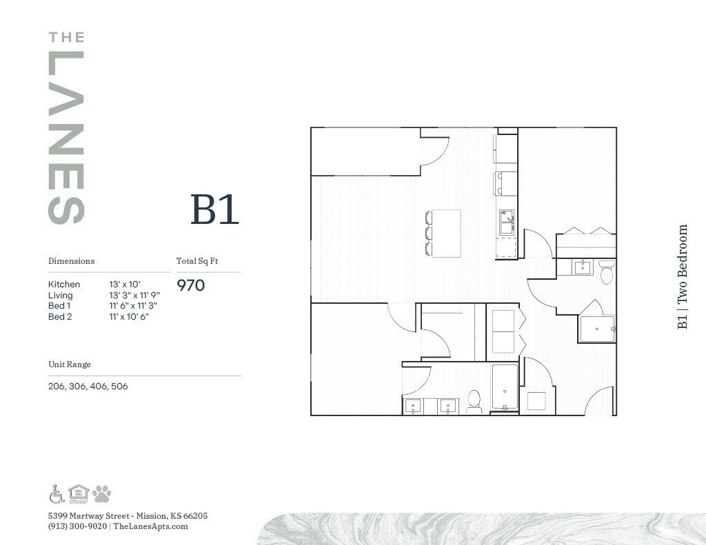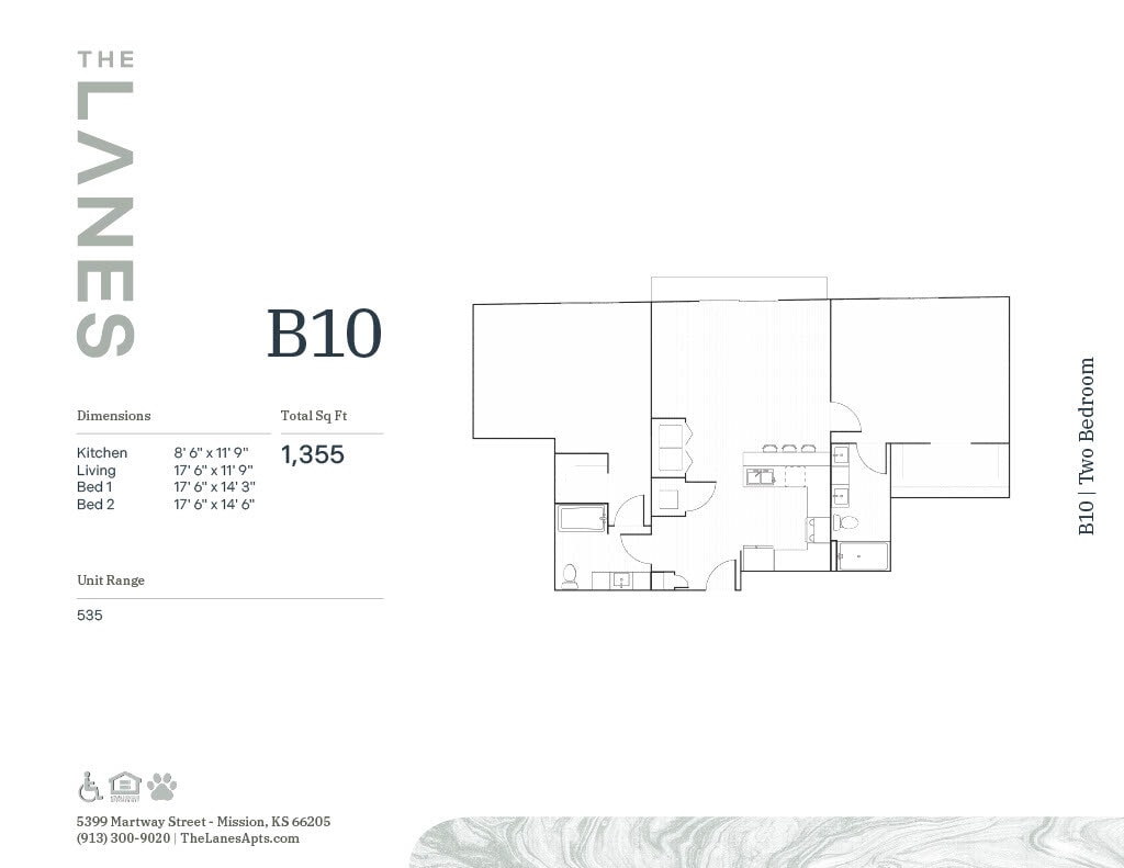 B10 - Floorplan 1 Apartment Unit: 535Apartment Model: B102 Bedroom, 2 Bath, 1355 sq ftAvailable NowFloorplan B1