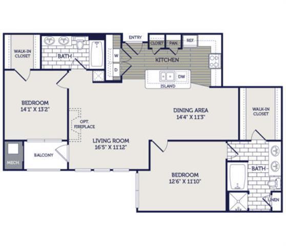 Claremont - Floorplan 1 Apartment Unit: 1427Apartment Model: Claremont2 Bedroom, 2 Bath, 1368 sq ftAvailable January 7, 2026Hewitt