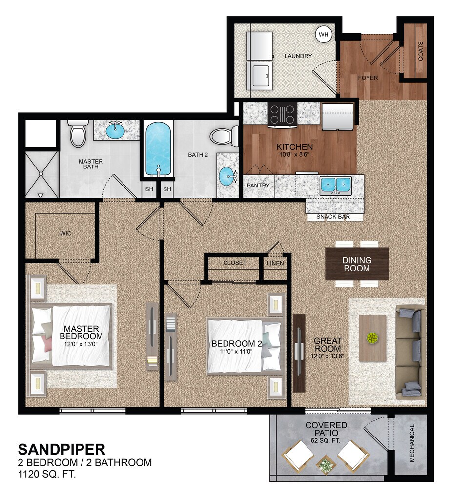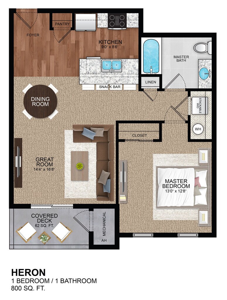 Apartment Model: HeronFrom $1,6601 Bedroom, 1 Bath, 800 sq ftUnavailableFloorplansPhotos![]()