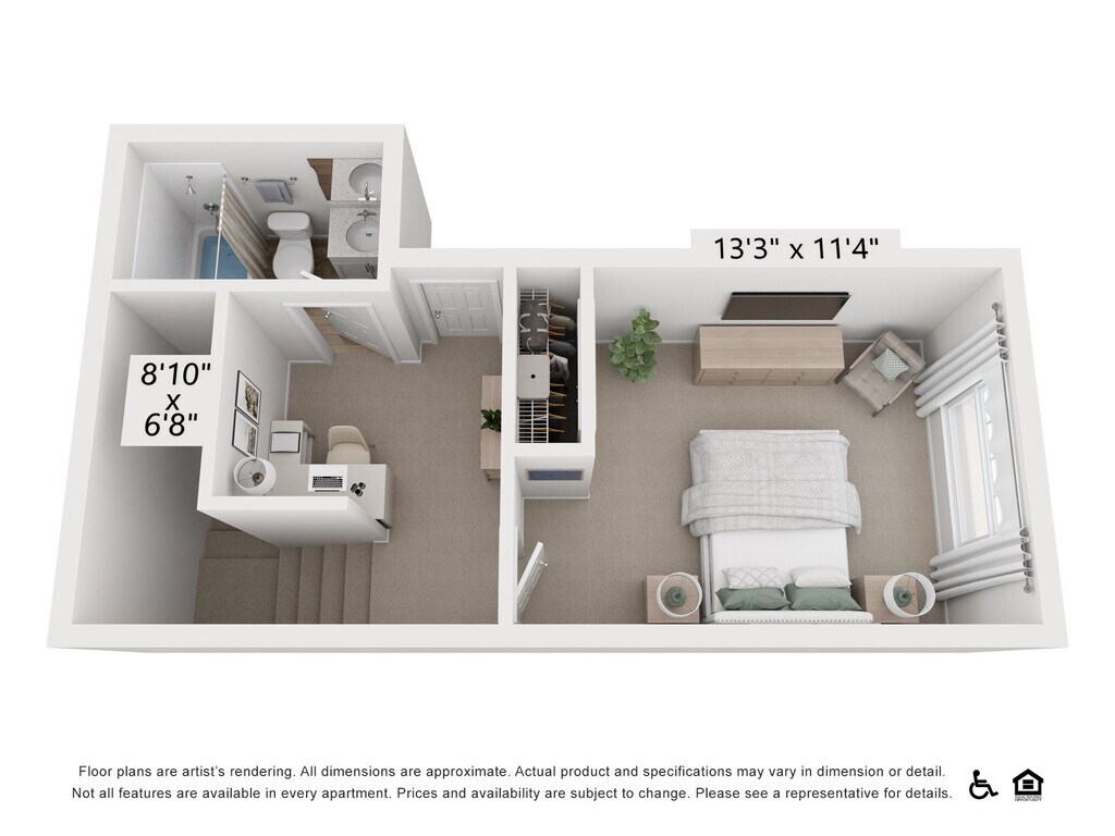 The Roland - Floorplan 1 Floor plans are artist's rendering. All dimensions are approximate. Actual product and specifications may vary in dimension or detail. Not all features are available in every rental home. Prices and availability are subject to change. Base rent is based on monthly frequency. Additional fees may apply, such as but not limited to package delivery, trash, water, amenities, etc. Deposits vary. Please see a representative for details.