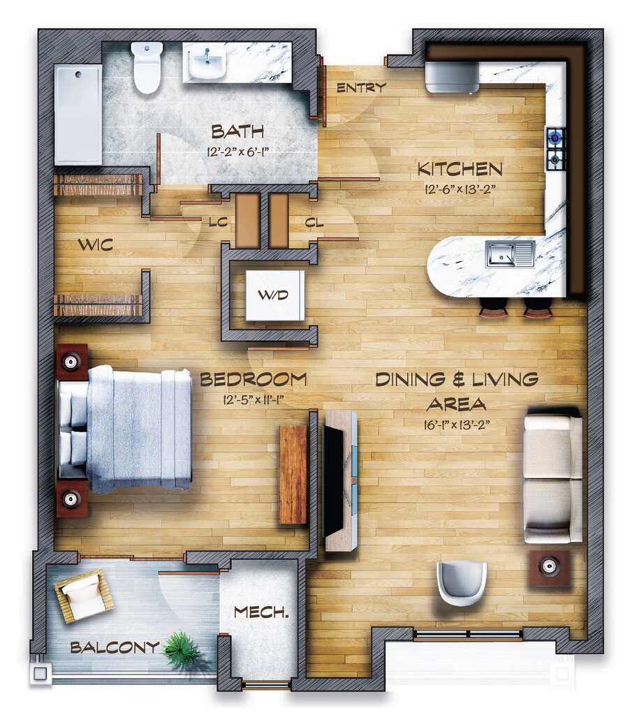 1 Bed, 1 Bath, 845 sq ftModel Gallery