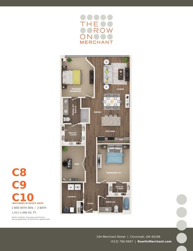 Apartment Model: 2 Bed, 2 Bath With Den - C8, C9, C10From $1,8452 Bedroom, 2 Bath, 1411-1443 sq ftAvailable Now![]()