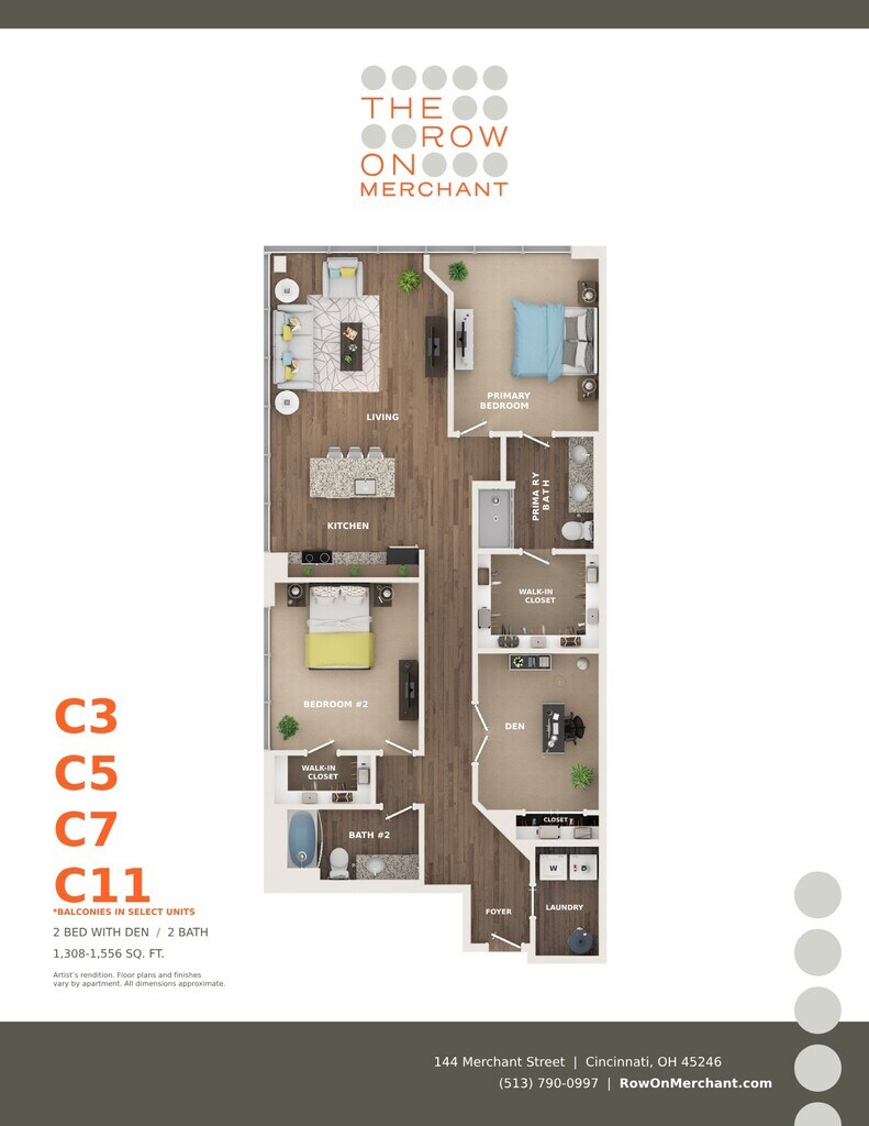 Apartment Model: 2 Bed, 2 Bath With Den - C3, C5, C7, C11From $1,8602 Bedroom, 2 Bath, 1308-1401 sq ftAvailable December 6, 2025![]()