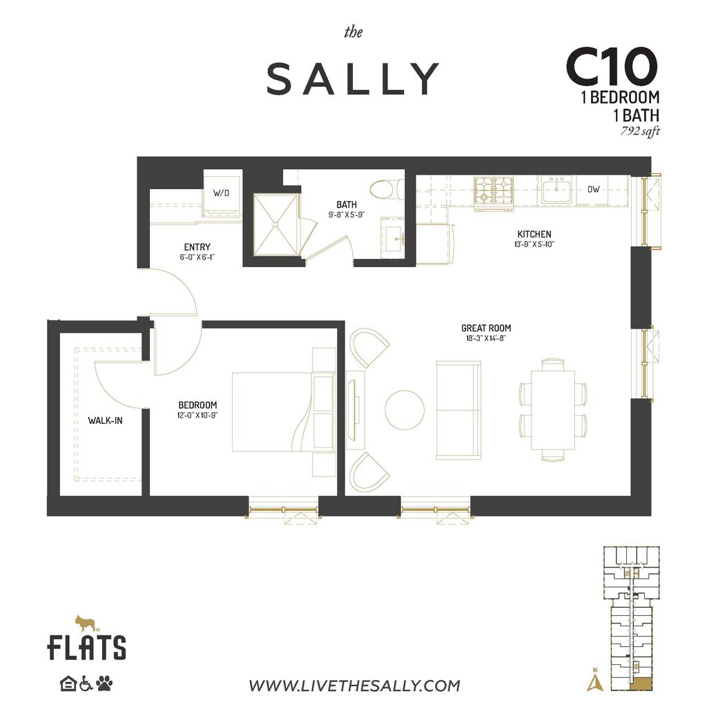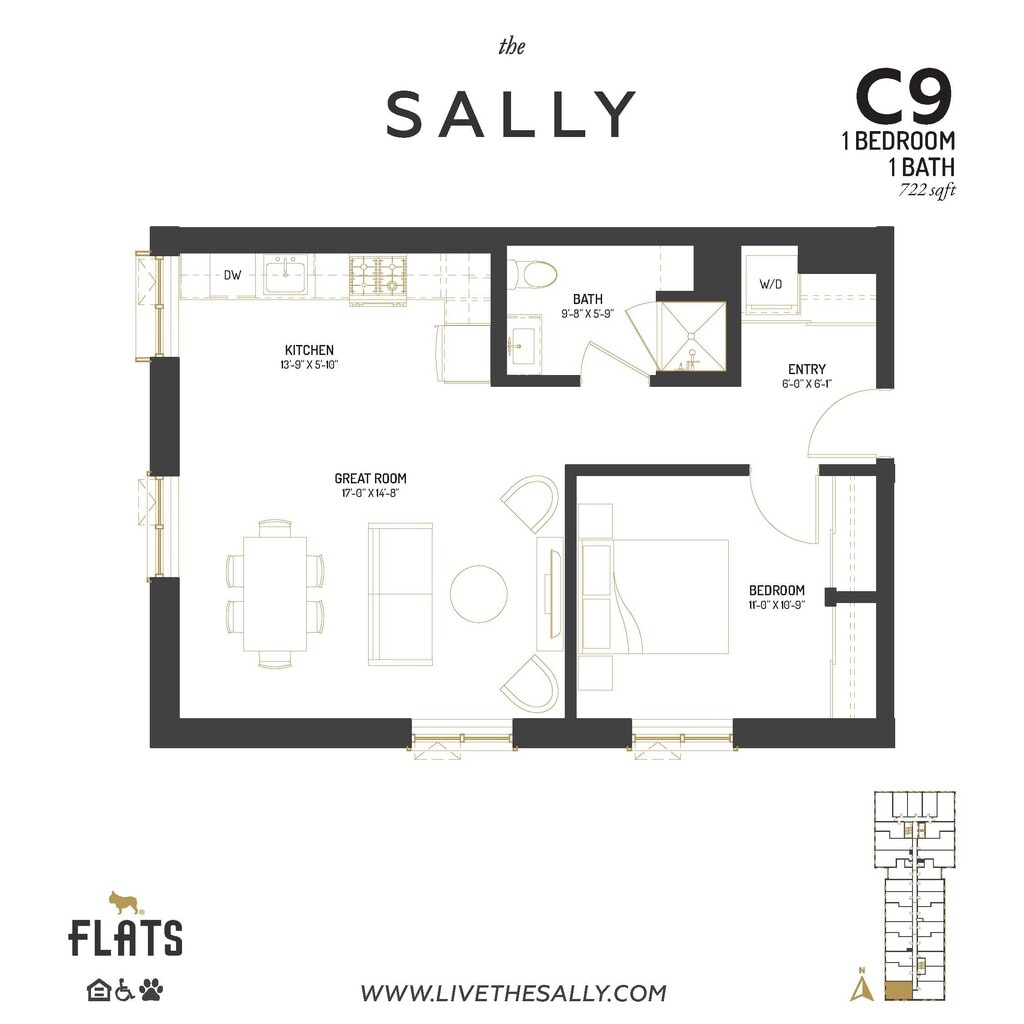 Welcome to The Sally, the second phase of Flats' largest adaptive reuse project in the Chicago, The Draper. The Sally pays homage to and compliments The Draper’s mid-century style and design through its sleek and sophisticated; ground-up construction. The Sally Phase 1 will offer 64-units, while the second phase will deliver an additional 116-units in 2024. Best-in-class amenities include a rooftop-lounge at The Sally, as well as 24/7 access to The Draper’s extensive amenity package, which includes a rooftop pool and lounge, tiki lounge, gym, theater, and dog run. Our community offers a wide range of spacious apartments designed to meet the needs of today's urban dwellers. With top-notch amenities and an unbeatable location, The Sally is the perfect place to call home. Step inside one of our beautiful apartments and you'll immediately feel at home. Each unit features an open floor plan with plenty of natural light, floor-to-ceiling windows, high ceilings, and modern finishes. Our apartments are equipped with stainless steel appliances, in-unit laundry, and ample storage space. Choose from a variety of floor plans, including studios and one-bedroom apartments. Located in the vibrant Uptown neighborhood, The Sally is just steps away from some of Chicago's best music venues, shops, dining, and lakefront. Whether you're looking to explore the city or enjoy a quiet night in, The Sally puts you right where you want to be. Experience the best of Chicago apartment living at The Sally.