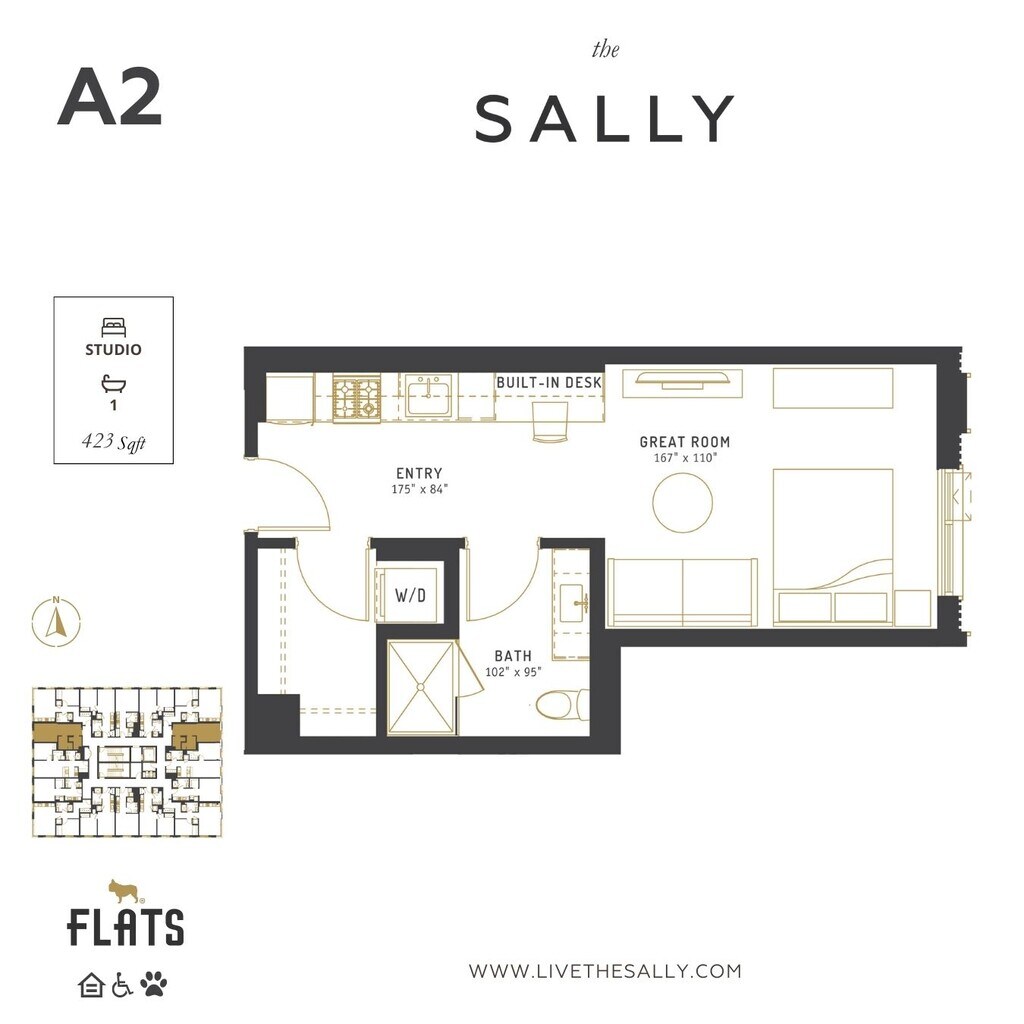 A2 - Floorplan 1 Apartment Unit: A216Apartment Model: A2$1,620Studio, 1 Bath, 423 sq ftAvailable January 2, 2026![]()