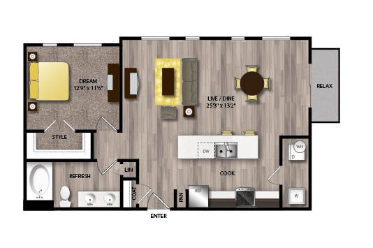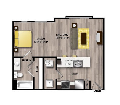 Studio, 1 Bath, 603 sq ftAvailable NowModel Gallery