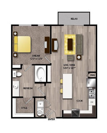 Apartment Model: E1From $1,216Studio, 1 Bath, 603 sq ftAvailable NowFloor plans are artist's rendering. All dimensions are approximate. Actual product and specifications may vary in dimension or detail. Not all features are available in every rental home. Prices and availability are subject to change. Base rent is based on monthly frequency. Additional fees may apply, such as but not limited to package delivery, trash, water, amenities, etc. Deposits vary. Please see a representative for details.