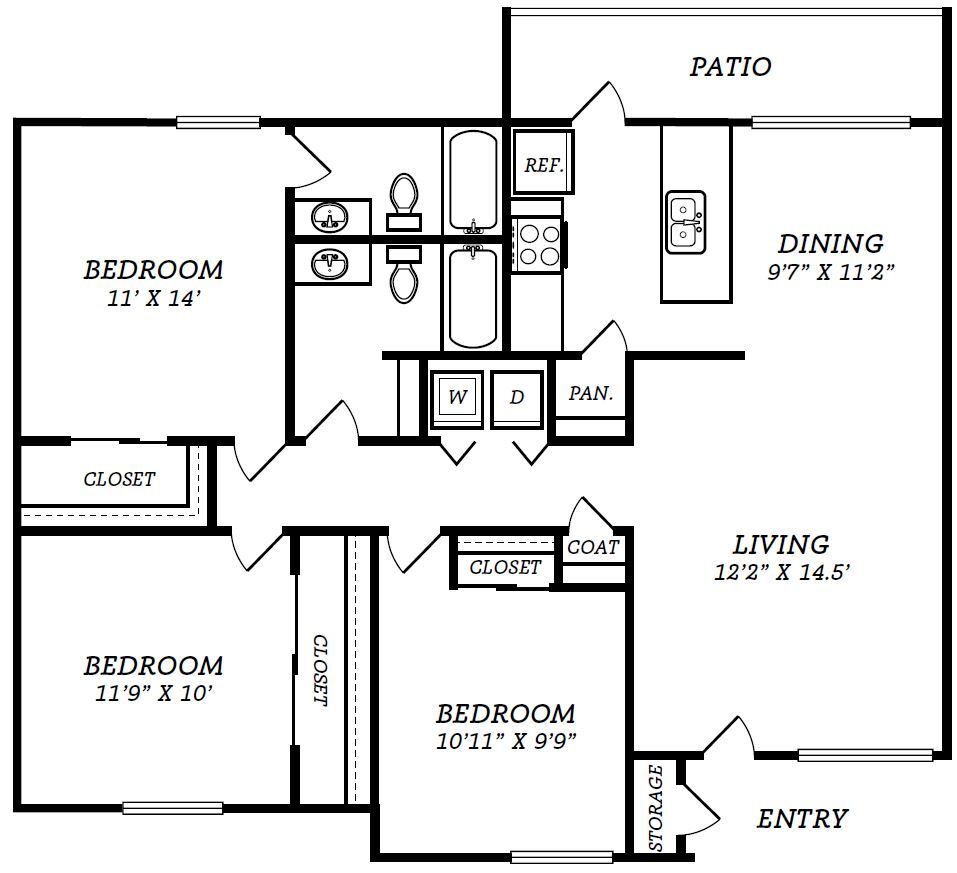Apartment Model: 2 Bed/1 Bath - B3 LayoutFrom $1,0252 Bedroom, 1 Bath, 944 sq ftAvailable Now![]()