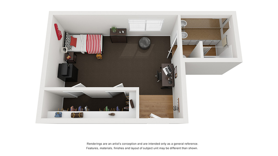 Studio - Floorplan 1 Apartment Unit: Full PrivateApartment Model: Studio$1,1191 Bedroom, 1 Bath, up to 346 sq ftAvailable August 10, 2026Studio XL