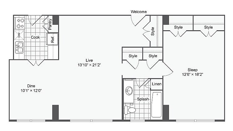 The Berlin - Floorplan 1 Apartment Unit: PrivateApartment Model: The Berlin$1,6591 Bedroom, 1 Bath, from 577 sq ftAvailable August 16, 2026The Berlin W/D