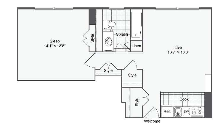 1 Bed, 1 Bath, 577 sq ftAvailable August 16, 2026Model Gallery