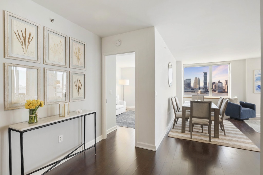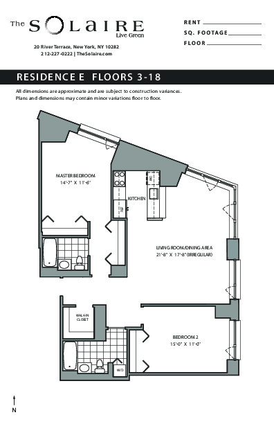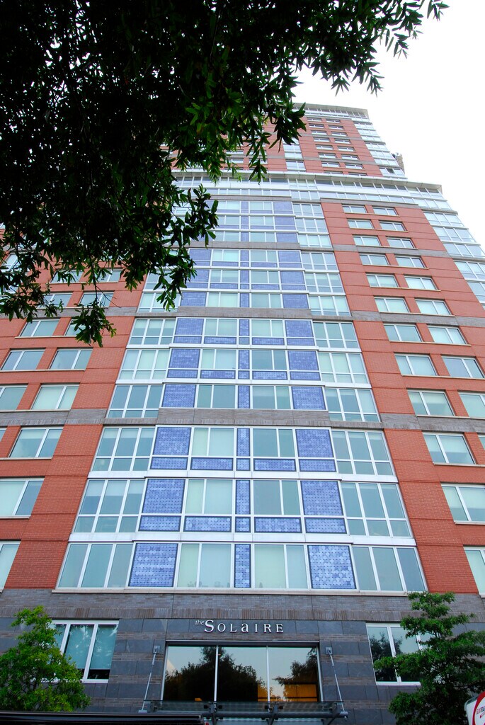 The Solaire is a full-service certified LEED platinum green building with a full host of services and amenities including a beautifully landscaped rooftop garden, a modern health club with a separate aerobics room, a children’s playroom, a 24-hour concierge, storage and bicycle rooms, an on-site valet parking garage, valet dry cleaning and Wi-Fi throughout. The gorgeous open kitchen layouts boast granite counter tops and are equipped with stainless steel energy star appliances. The bathrooms are clad in marble and limestone. The most unique feature of each residence is it’s central heating and cooling system which provides maximum comfort by allowing residents to control the temperature year round via a digital programmable thermostat. All of the air and water in the apartments are centrally filtered.