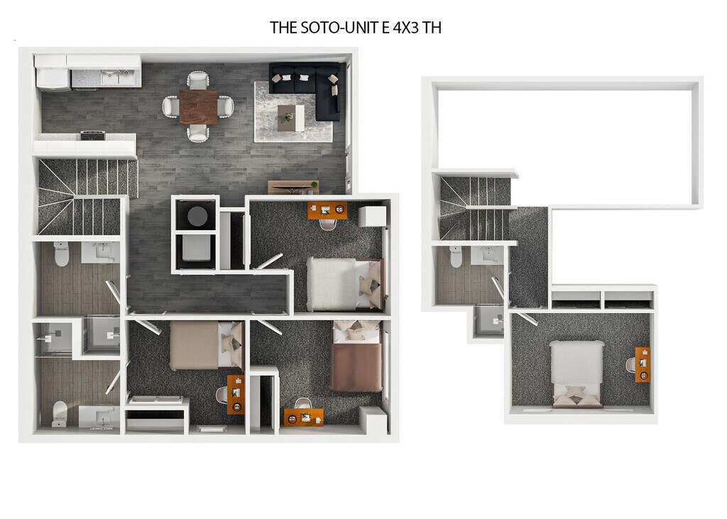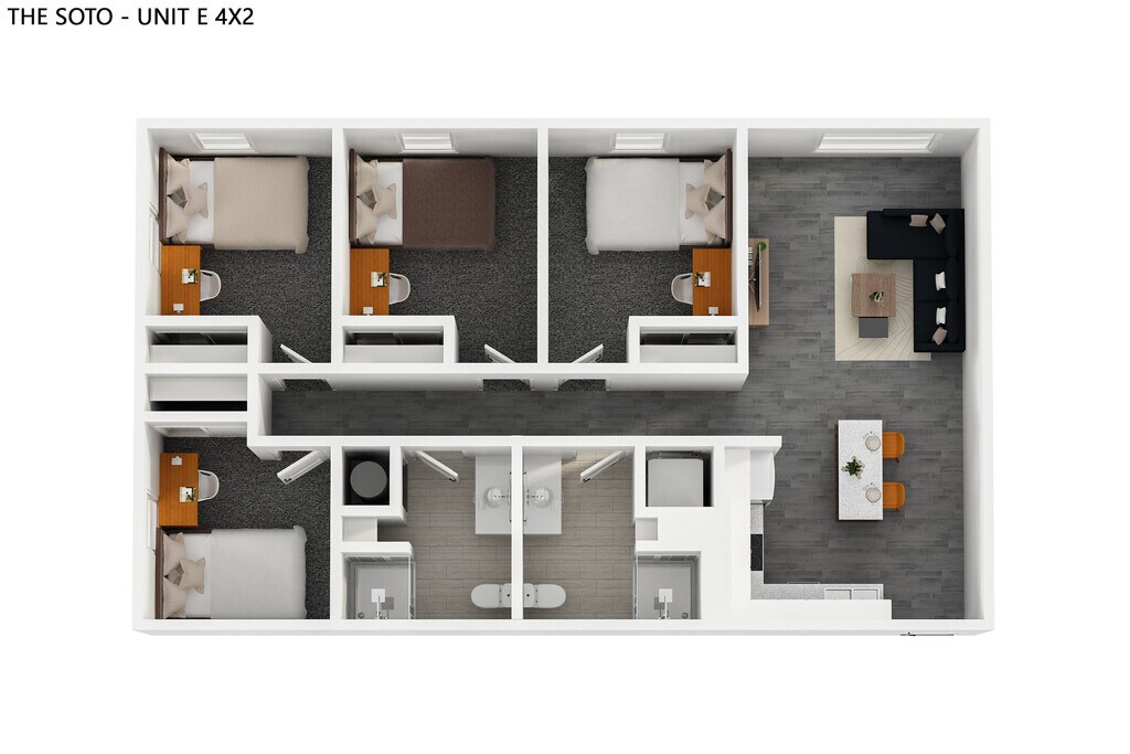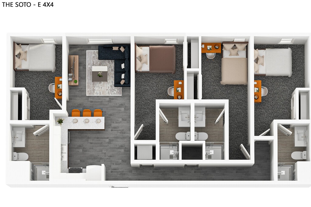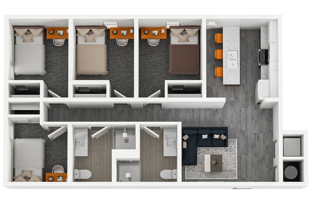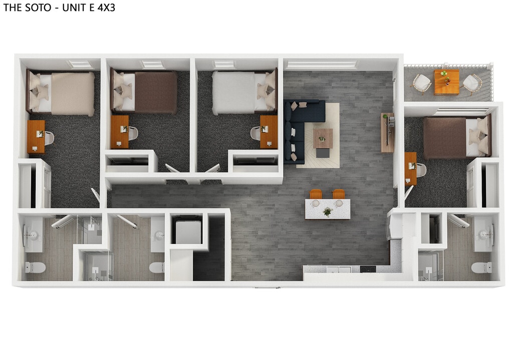 E3x3 - Floorplan 1 Apartment Unit: PrivateApartment Model: E3x3$1,2403 Bedroom, 3 Bath, 1056 sq ftAvailable NowApartment Unit: PrivateApartment Model: E3x3$1,2153 Bedroom, 3 Bath, 1056 sq ftAvailable September 18, 20264 Bedrooms