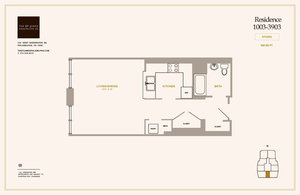 Enter the luxurious 45-story St. James on historic Washington Square, Philadelphia and experience the many benefits afforded to residents. Upon arrival, be welcomed by the full-time doorman, and find the 24-hour concierge available in the exquisitely appointed lobby. Spacious layouts are available in modern studio, one, two and three bedroom residences. Enjoy unsurpassed, hotel-style amenities, a fitness center, swimming pool, courtyard, private balconies, garage parking, and on-site retail. Only steps away from transportation, shopping, fine dining, hospitals, universities, businesses, and Philadelphia's cultural, city and national landmarks.